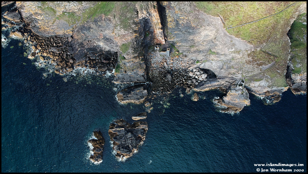 Another view of the South Bradda Mine buildings. The mines office is on the right and a long gone walkway across the rocks linked it to the main buildings on the stoney beach.