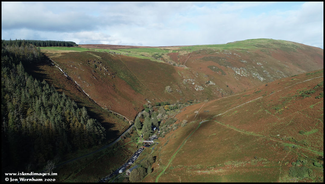 Looking northwards along Sulby Glen with the little hydro electric generating plant at the bottom of the picture and the waterfall on the left.