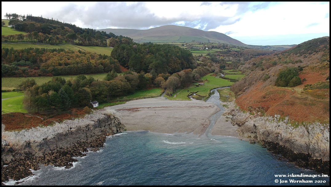 Port Cornaa, where we started our walk. It's low tide and a large amount of stony beach is exposed here, you can see from the seaweed where the water reaches at high tide. North Barrule in the background.