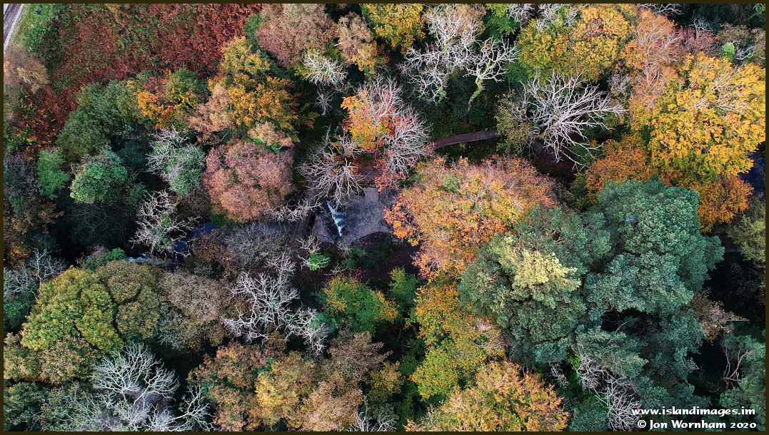 A vertical view looking down on the trees at the tope end of the glen. Lovely colours, although some of the trees have already lost their leaves.