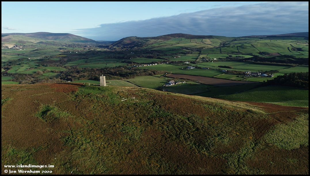Looking past the tower and along the central valley towards St John's. Below the hill to the right of the tower is Knockaloe Farm, the site of a big internment camp in WW1.