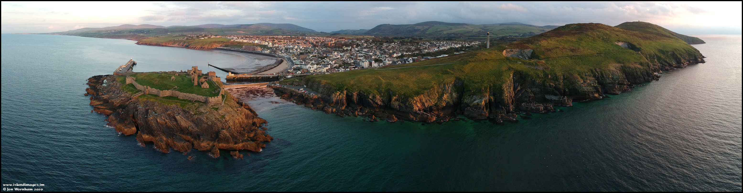 Sunset panorama looking from Peel Castle on St Partick's Isle, past the town and to Peel Hill.