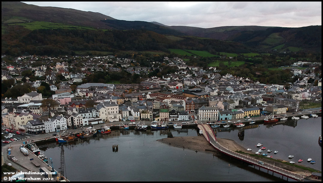 Turning the camera back towards the quayside in Ramsey Harbour. Several local fishing vessels are on the quay. The light is fading fast and you can see headlights from cars on the Mountain Road.