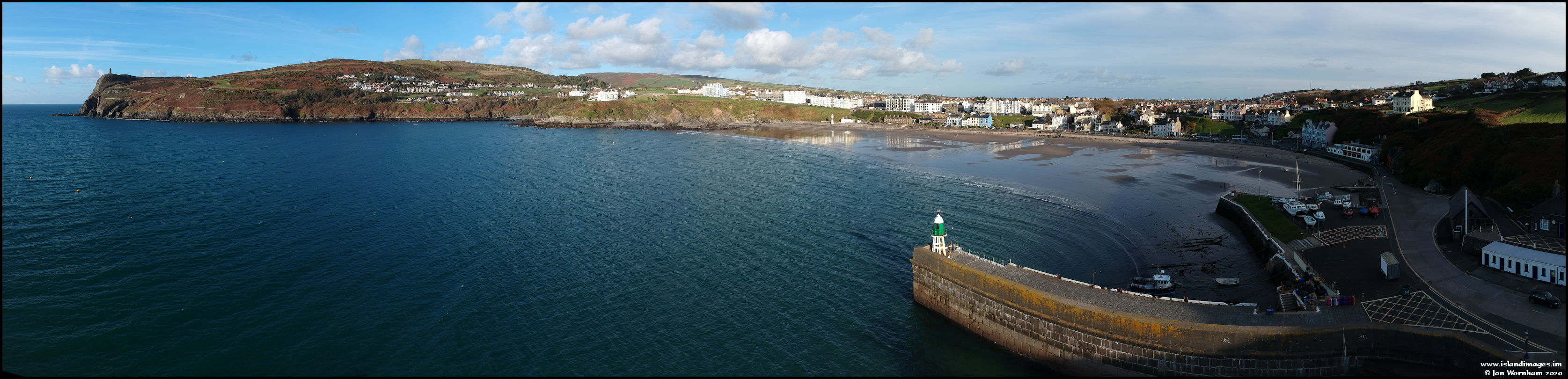 A fairly low altitude panorama looking from Bradda Head on the left and then past the town and to the small breakwater.