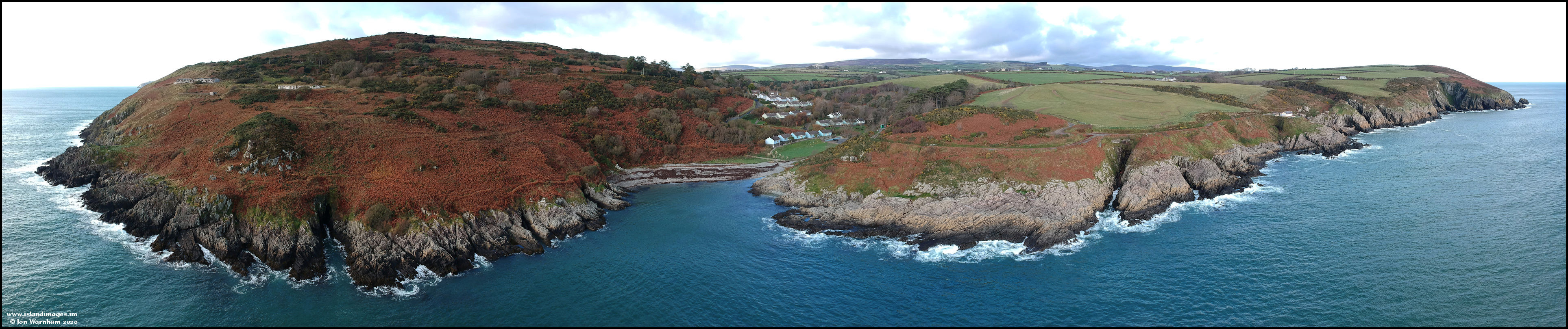 Panorama centred on Groudle Bay. The few remaining buildings of the former Howstrake Holiday Camp can be seen on the headland to the left.
