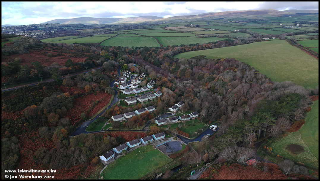 Looking across the Groudle cottages to the glen behind. The Manx Electric Railway line can be seen following the road on the left and the Groudle Glen Railway's Lime Kiln Halt just gets into shot at the bottom.