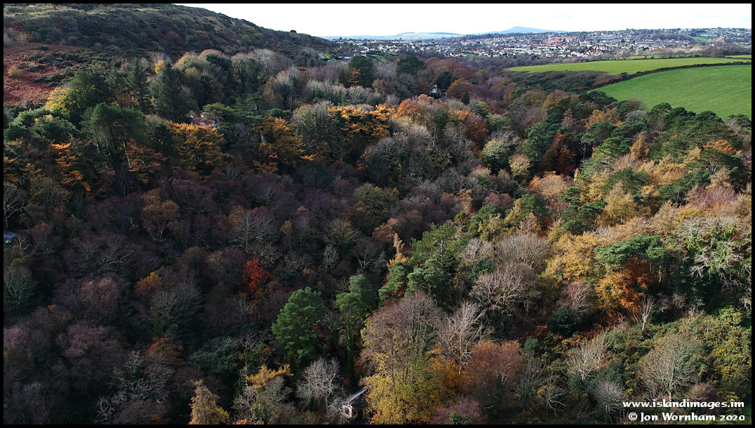 Autumn colours in Groudle Glen, with part of Onchan visible on the skyline.