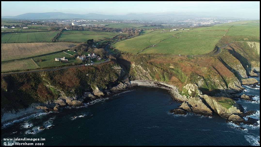 The little cluster of houses above the beach at Keristal. It was rather a hazy afternoon, but the outskirts of Douglas can be seen in the distance.