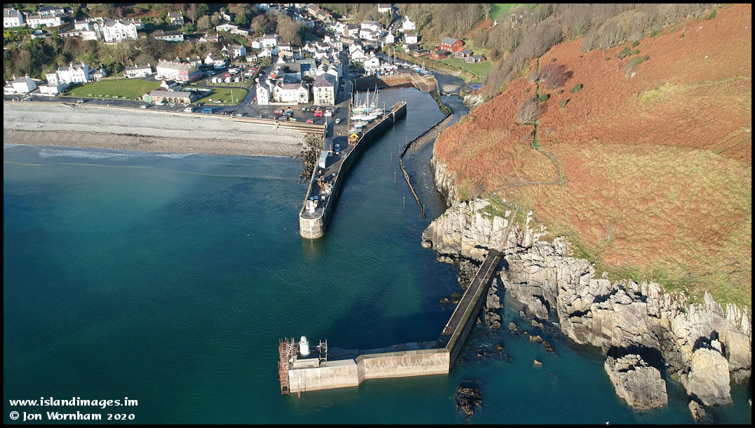 A higher altitude look at the harbour entrance. The Laxey River can be seen running in its separate channel to the right of the harbour area.