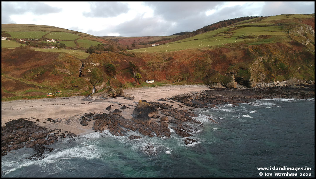 Flying out over the sea to look back at the little cottage and the waterfall.