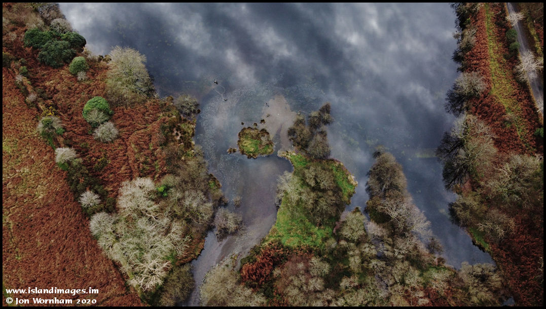A vertical view looking down on the north end of Injebreck Reservoir where it is fed by the River Glass. Some nice cloud reflections on the water.