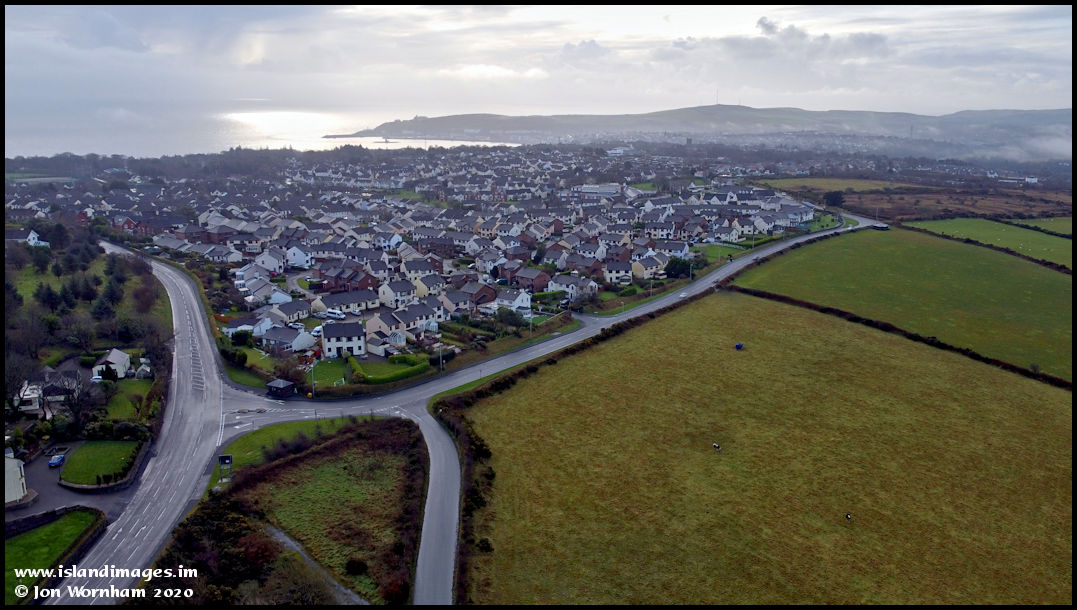 Cronk-ny-Mona juction. It's rather dull here but the sun is shining off the sea in the distance and picking out Douglas Head and the Tower of Refuge.