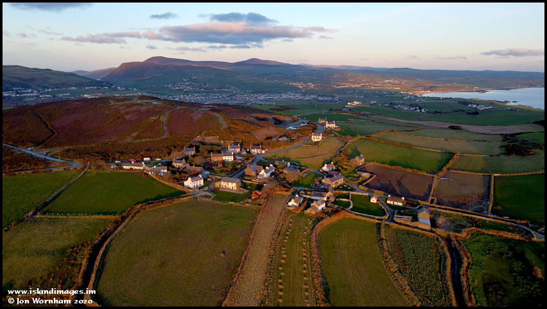 Looking across Cregneash with the houses of Port Erin speading out behind.