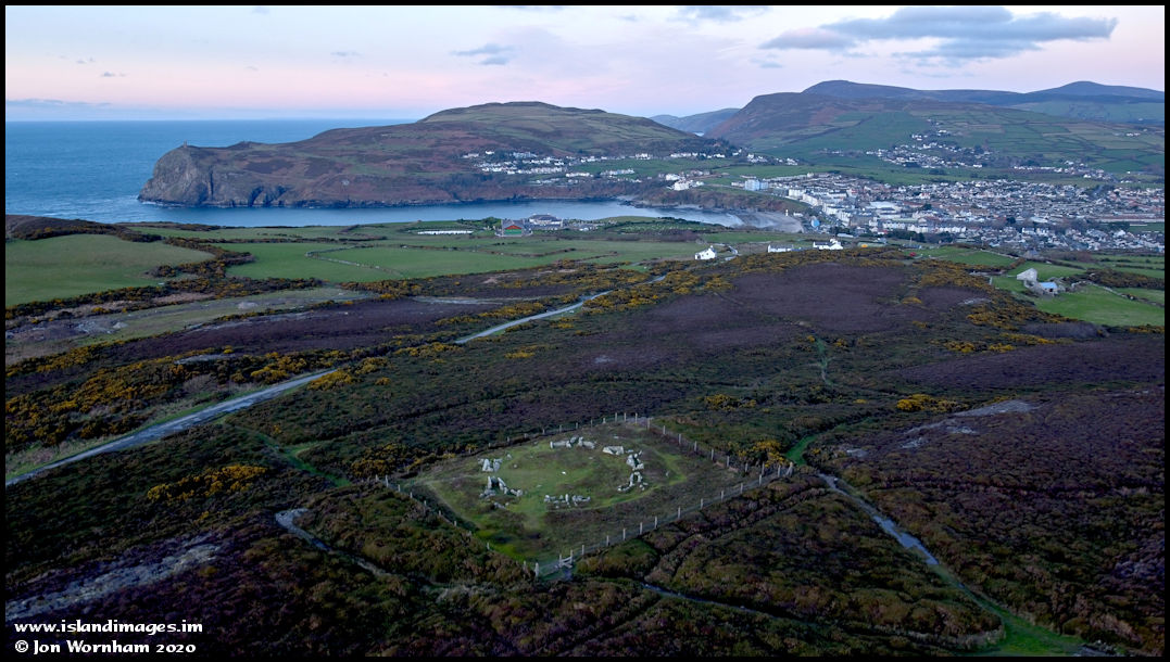 Looking across the ancient Neolithic stone burial circle on Mull Hill to Port Erin Bay.