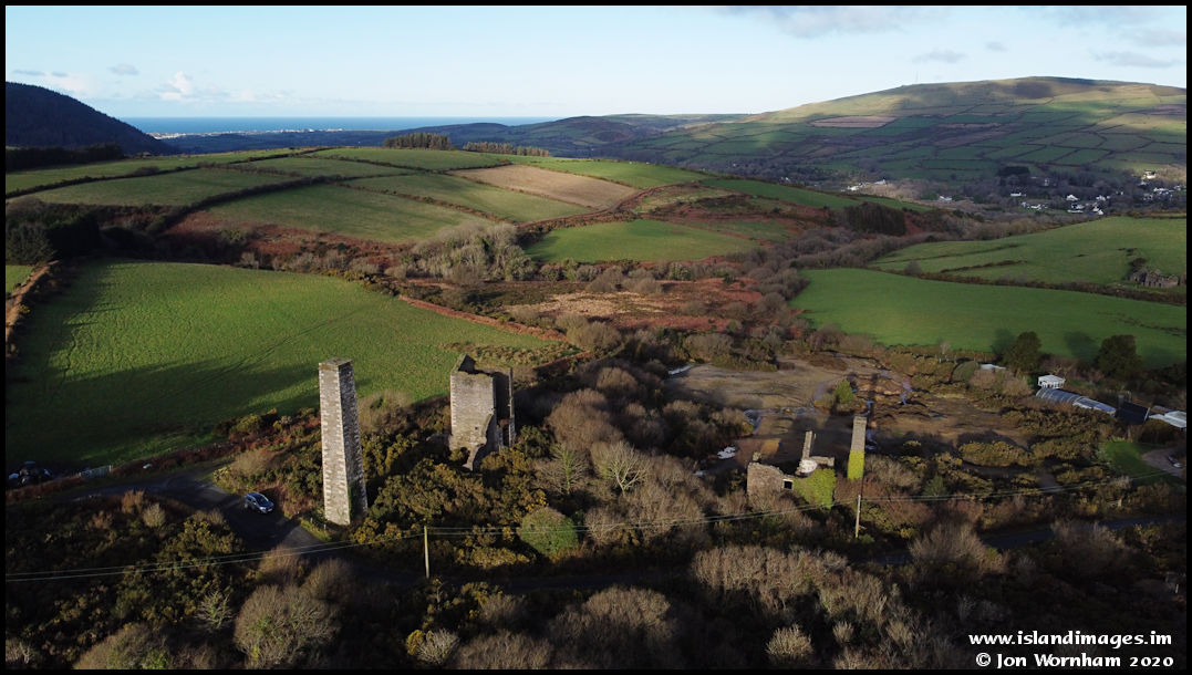 Flying around the old mine to look more in a westerly direction, with the City of Peel just visible in the distance.