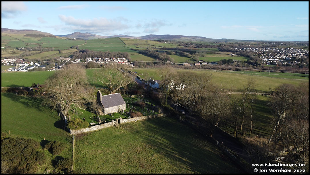 Climbing up higher to include the villages of Crosby (left) and Glen Vine (right) in the picture. The new church isn't really visible but is towards the edge of Glen Vine.