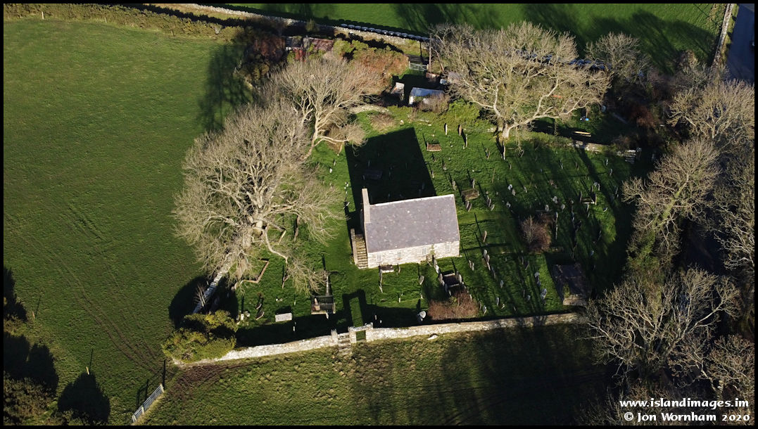 A near vertical view of the church and graveyard. Three Manx bishops are reputed to be buried here.