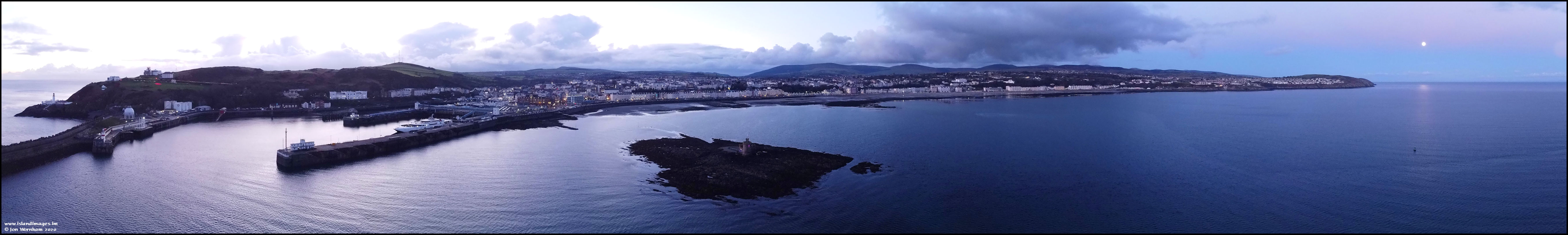 Panorama looking over Douglas Harbour and the bay, with an almost full moon rising over the sea.