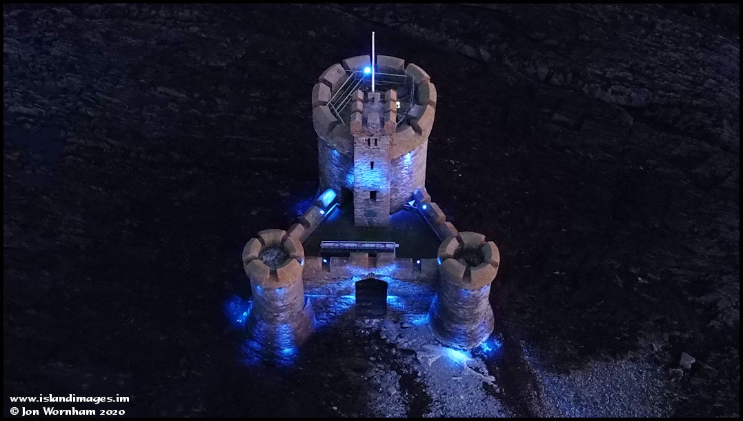 A semi-vertical view of the tower, with the lighting colour now on blue.