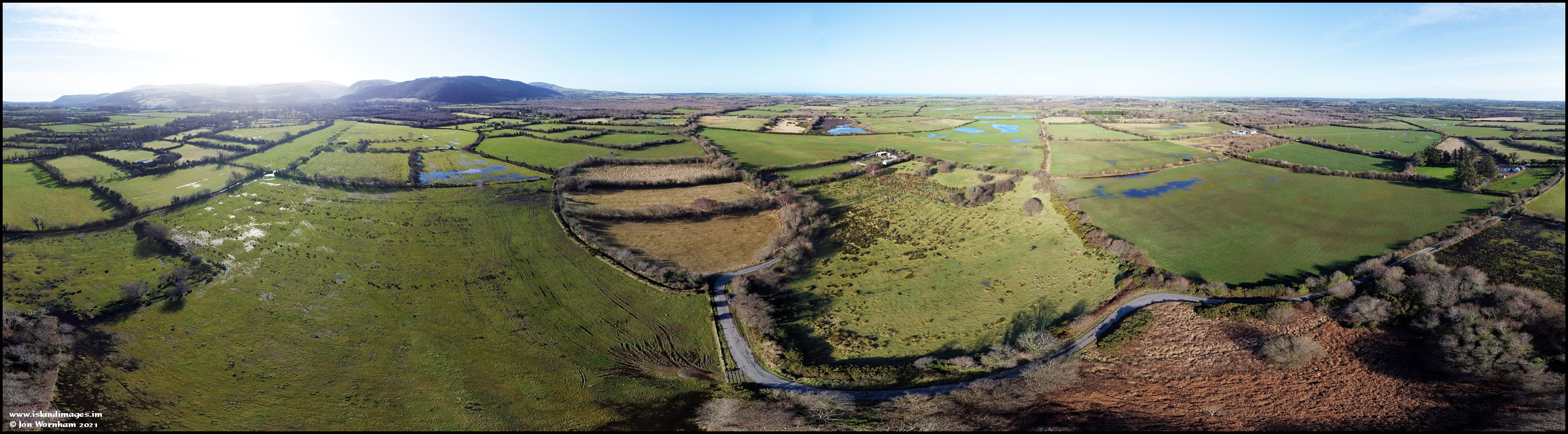 Moaney and Crawyns Meadows are the lighter coloured areas in the centre foreground of the picture, with other farmland around. It's very wet with flooded areas visible in several fields.