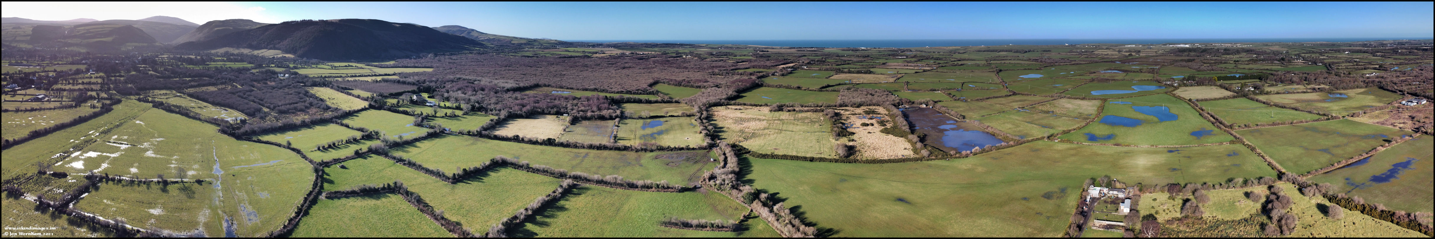 A wider panorama shot from more or less overhead the meadows. Sulby Glen can be seen on the left, then we look over Ballaugh Curragh in the centre and with Jurby Church and airfield buildings in the distance on the right.