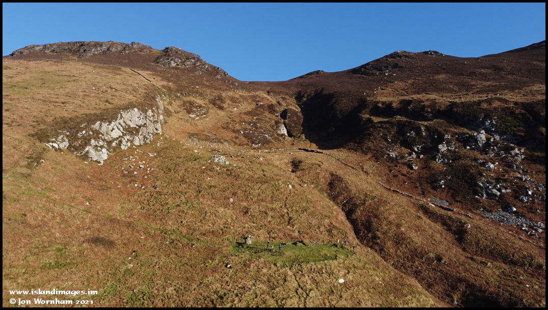 Moving offshore a bit and down to a lower level to show the steep slopes of Cronk-ny-Arrey-Laa rising above the keeil site.