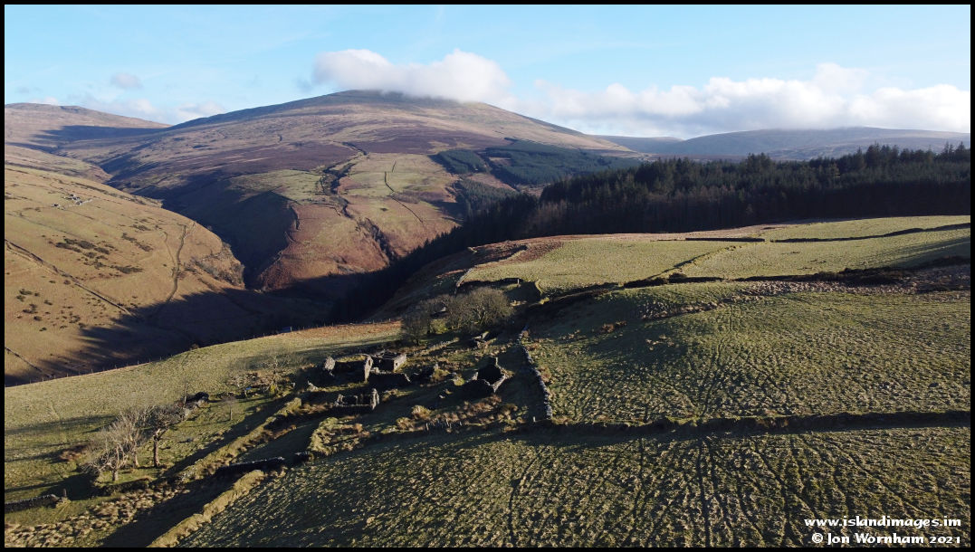 Looking across Killabrega to Snaefell. I was expecting a much softer light at the end of the day, but it seemed very harsh on the grass around the tholtan, compared with the hillsides in the distance.