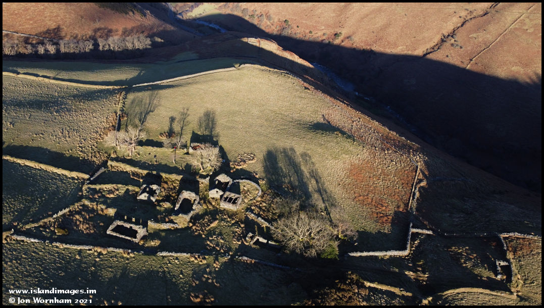 A semi vertical view with the trees casting long shadows just before sunset. The circular walk for the horse powered mill and associated buildings stand out well.
