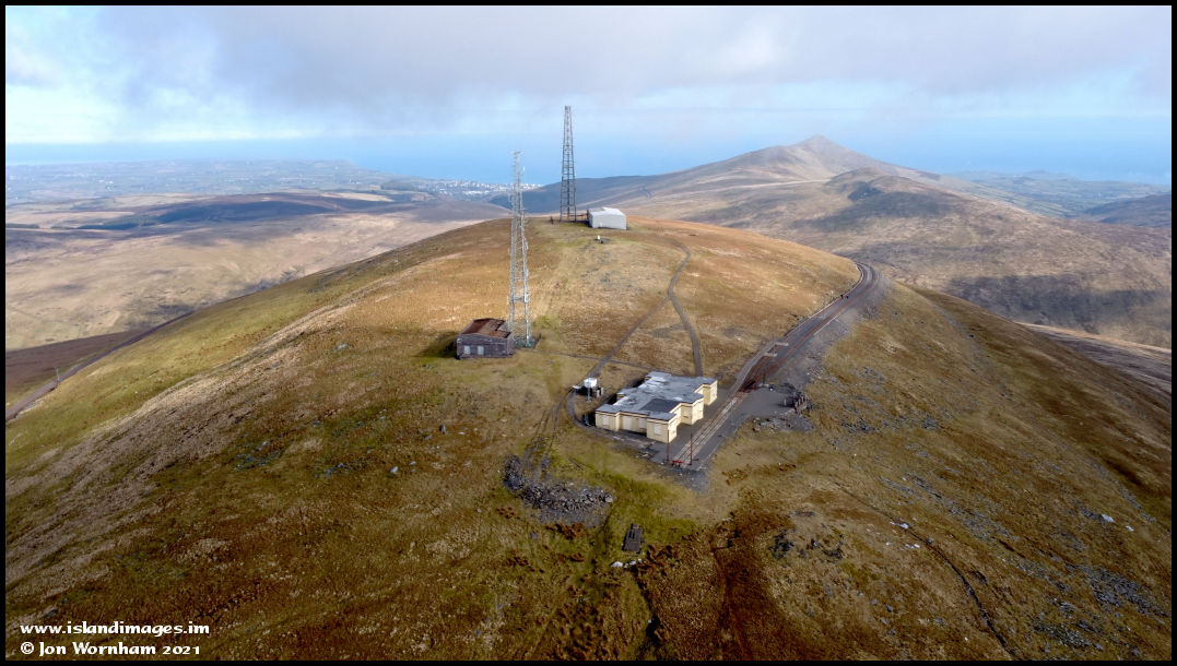 A patch of sunlight illuminates the summit, which is marked by the white Triangulation Pillar that can be seen in front of the far radio station, which provides services for en-route Air Traffic Control from the London and Scottish Centres.