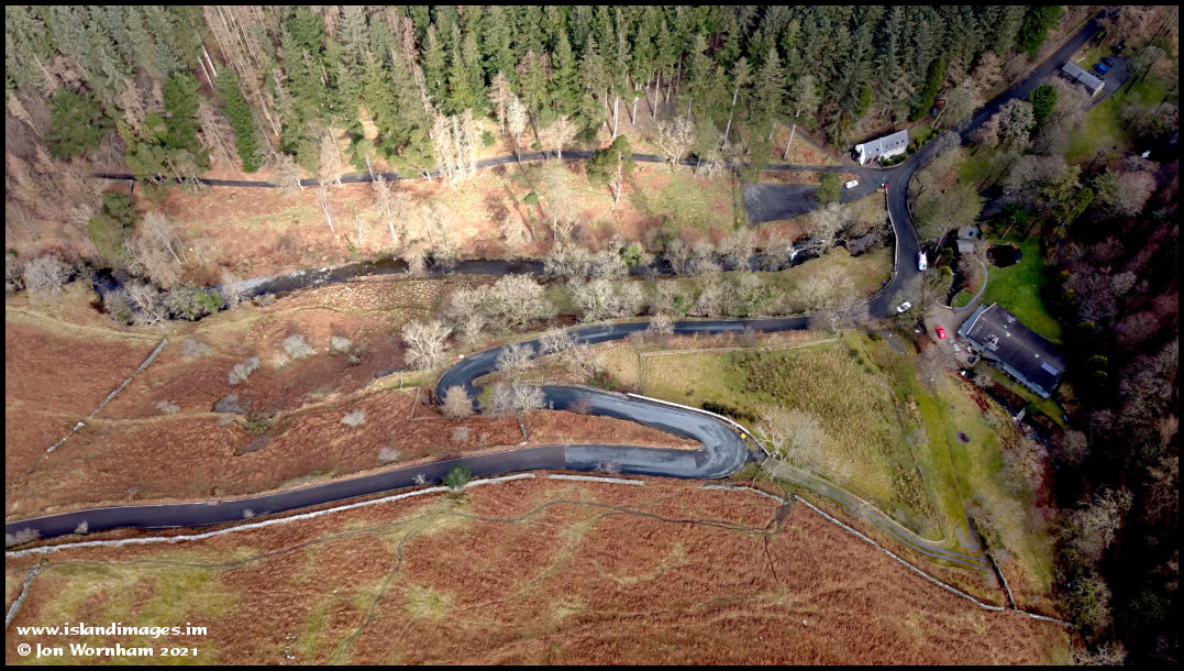 Looking just beyond The Creggans, where the roud winds down into the Glen at Tholt-y-Will via these two hairpin bends.