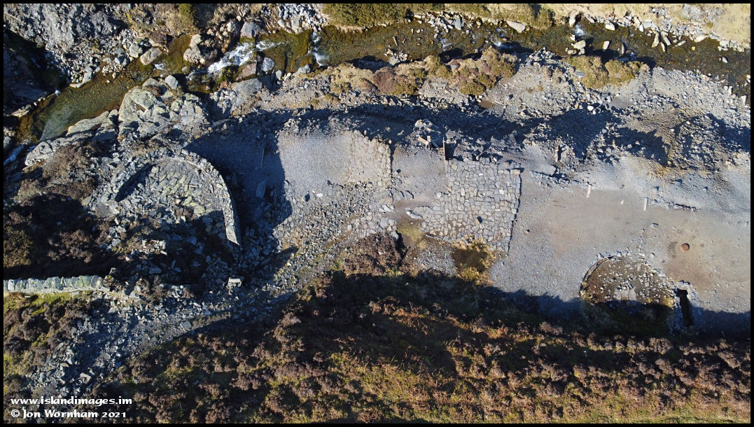 A closer view of the washing floors at the mine, where the mined ore would be smashed into smaller pieces on the flat stones and washed out from the waste in the circular buddles.