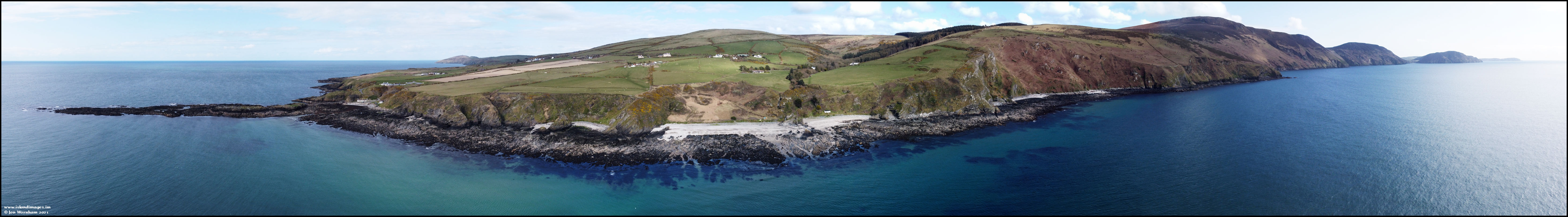 A stitched panorama looking from the 'Tail of Rock', past the Niarbyl cottages and Traie vane, then down the coast to Bradda with the Calf of Man in the distance.