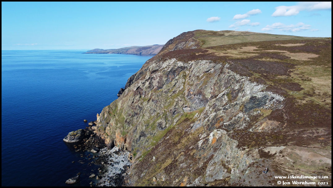 Back in the air again and looking along the steep cliffs north of Bradda Head. Down by the stony beach is the remains of the old North Bradda Mine. Niarbyl and Peel Hill are in the distance.