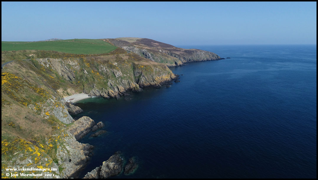 This view is from above the headland, looking north along the coast, past The Whing and to Little Ness. The drone is at around the level of the Marine Drive.