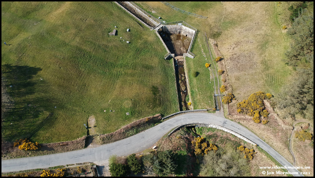 A vertical view of where the road crosses a young Silverburn River on a narrow and tight bend.