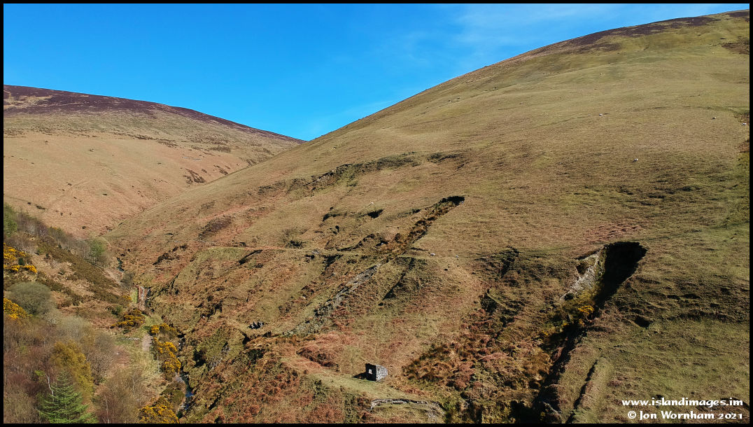 The actual quarries are disappearing back into the landscape but can be seen as scoops out of the hillside. There are the remains of two further buildings down by the quarry track.