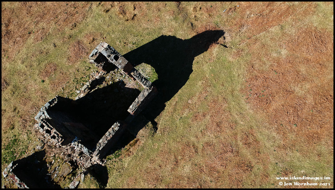A vertical view of the north end of the main buildings, with the bell tower casting a distinctive shadow on the ground. This was the workshops area with a large arched entrance.