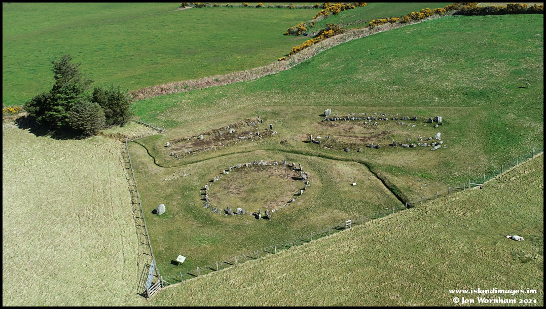 A semi vertical view of The Braaid. The roundhouse was a Iron Age celtic type house, with the longhouses being later Norse additions, showing the coming together of the two cultures in the Isle of Man.