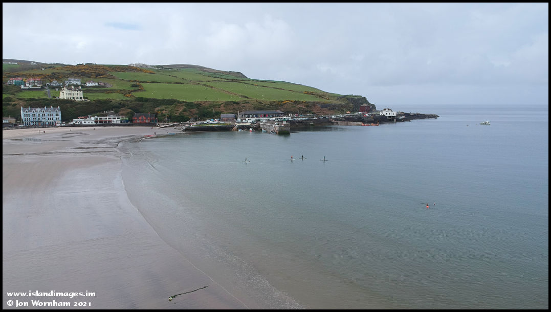 Turning the view around and looking south. The beach was surprisingly quiet for a Sunday morning, but there are paddle-boarders and swimmers in shot.