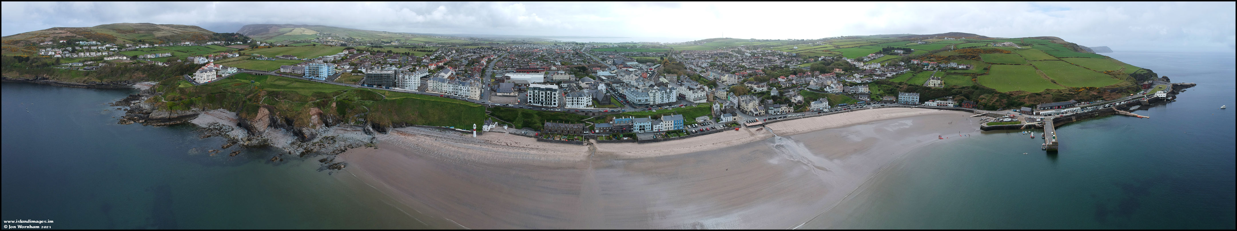 A higher level manual panorama centred on the northern end of Port Erin Beach.