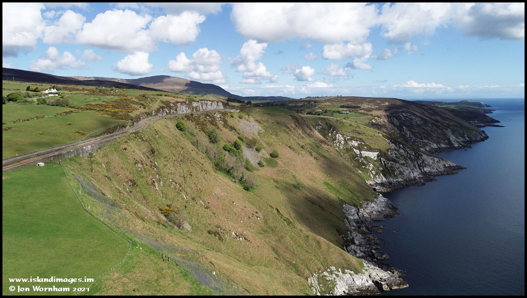 Looking north along the cliffs at Bulgham with the narrow ledge that carries road and railway clearly visible. Maughold Head and North Barrule can be seen in the distance.