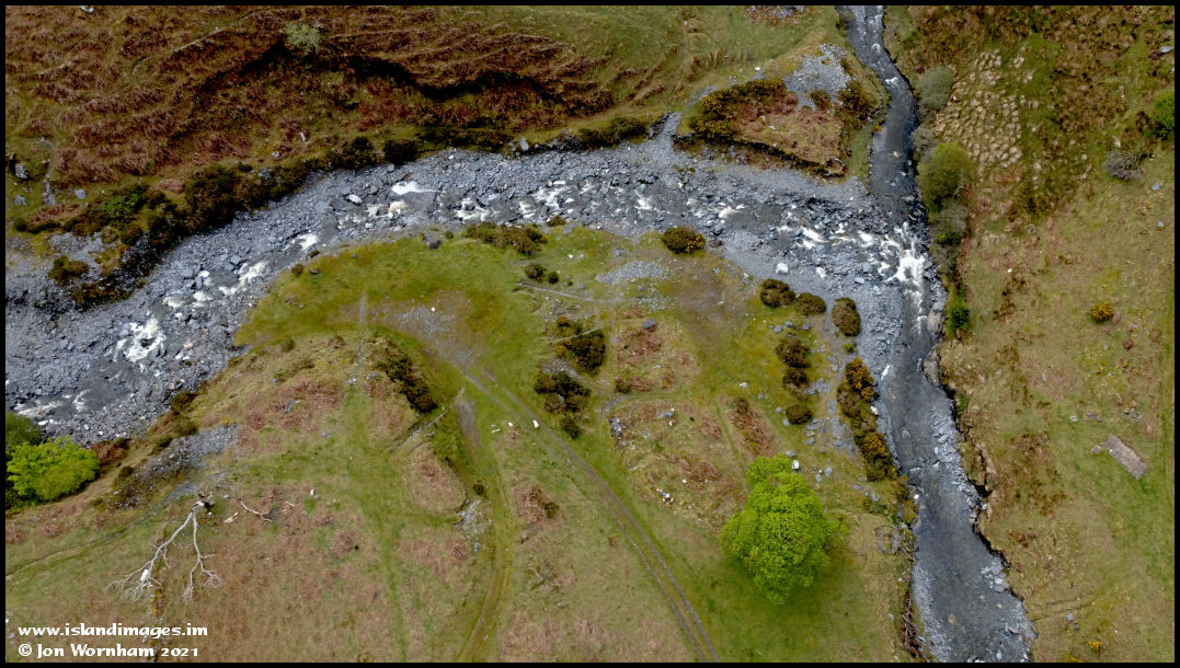 Confluence of the Sulby River (right) and the Block Eary stream. Most of the year the Block Eary stream flows under, rather than over these rocks and only after heavy rain does it appear as here.