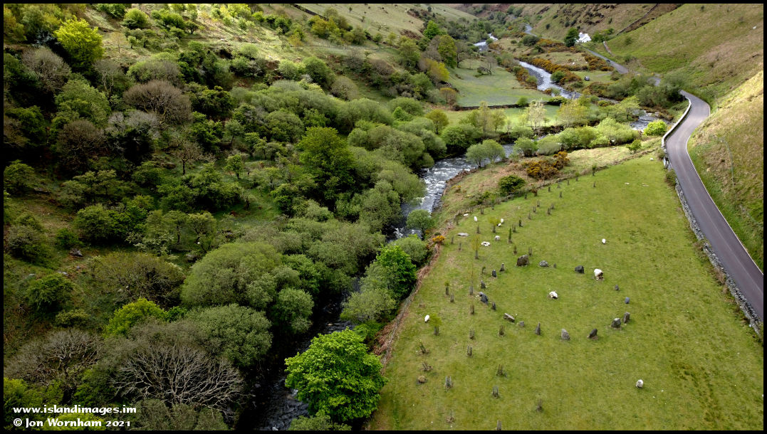 Looking upstream and past a modern day stone circle.