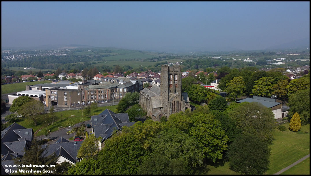 Flying at just over treetop height for a view of St Ninian's church with the school behind it.