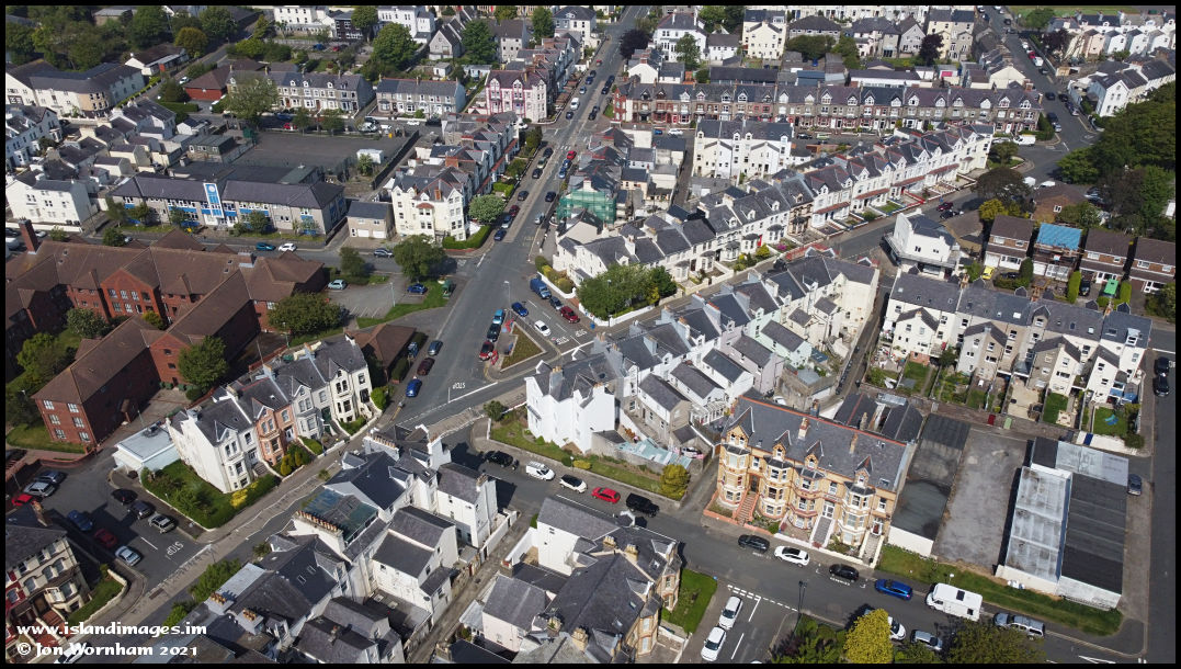 View from overhead Hutchinson Square gardens to the junction of Ballaquayle Road and York Road. The depot and power station for the Douglas Cable Tramway used to be located where the brown coloured building on the left now stands.