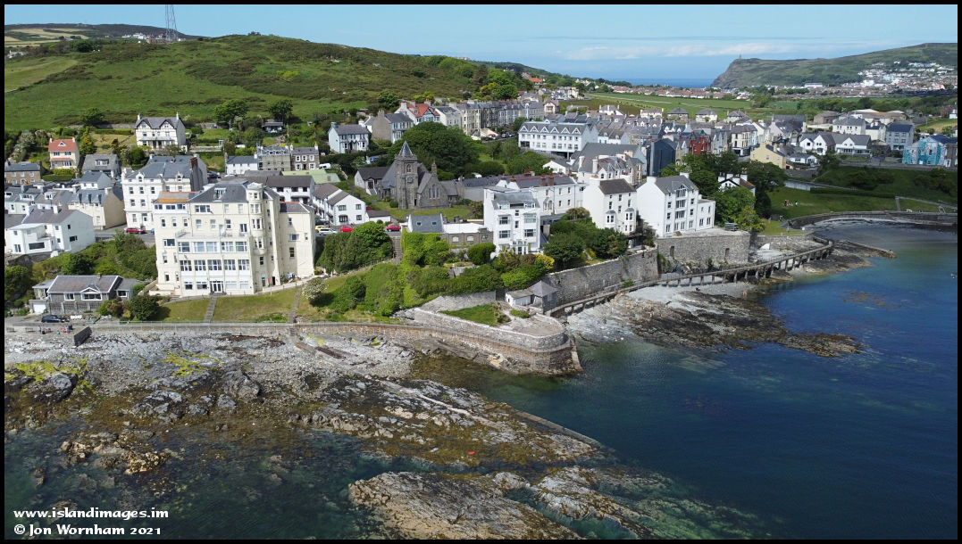 Looking down to the pedestrian walkway that runs along the shoreline between the harbour and Chapel Bay. St Mary's Church can be seen between the houses.