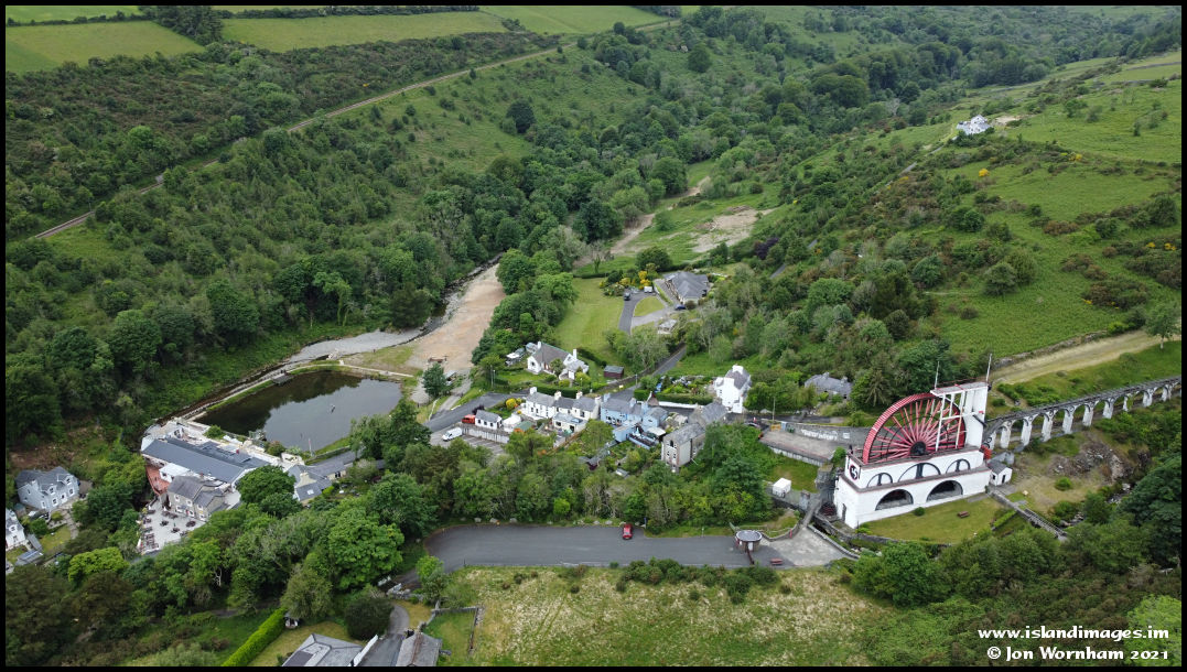 This view past the Laxey Wheel takes in the lower section of the nature reserve, which starts just behind the Salmon Centre lake and extends up the glen, with a footpath climbing up to join the Agneash Road.