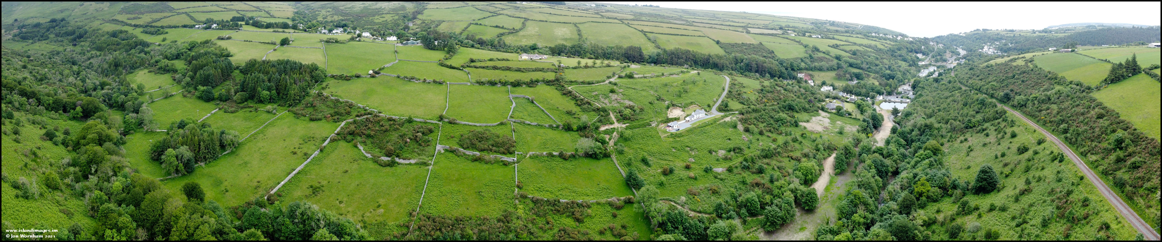 Another stitched panorama from seven pictures. This shows the interesting stone walled fields in the valley below Agneash, which have some unusual features probably connected with water collection for the Laxey Wheel.