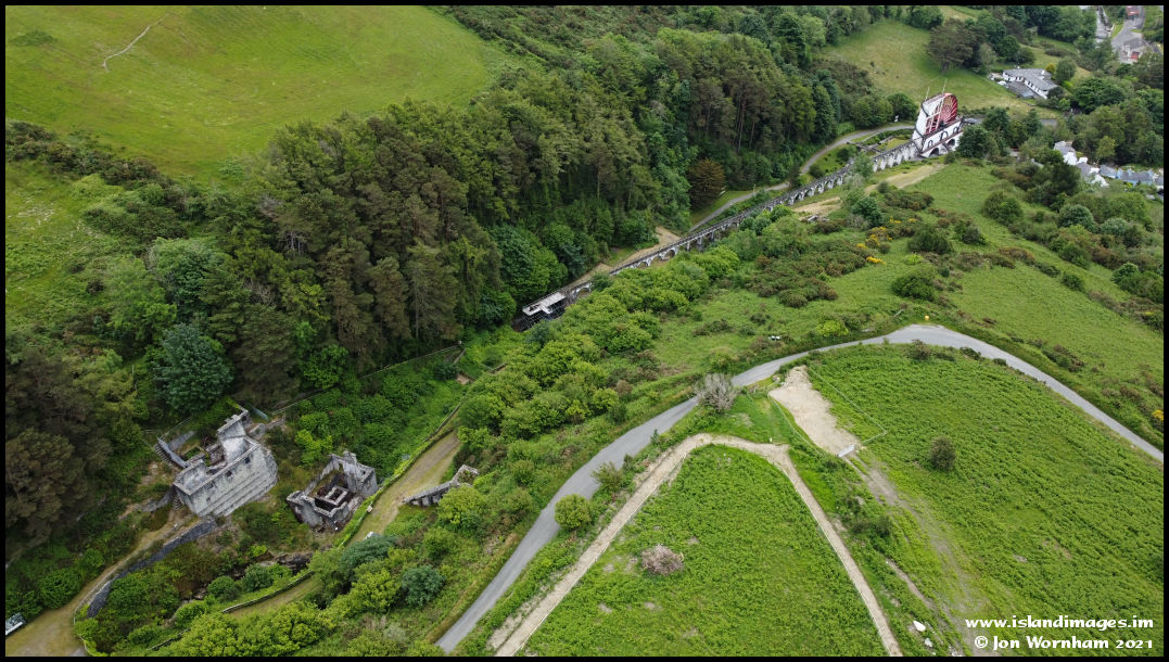 The length of the drive shart from the Laxey Wheel to the mine pumps (centre) further up the glen is very obvious here, with the engine and machine houses on the left.