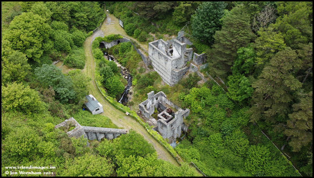 Looking down at the engine and machine houses at the Great Laxey Mine.